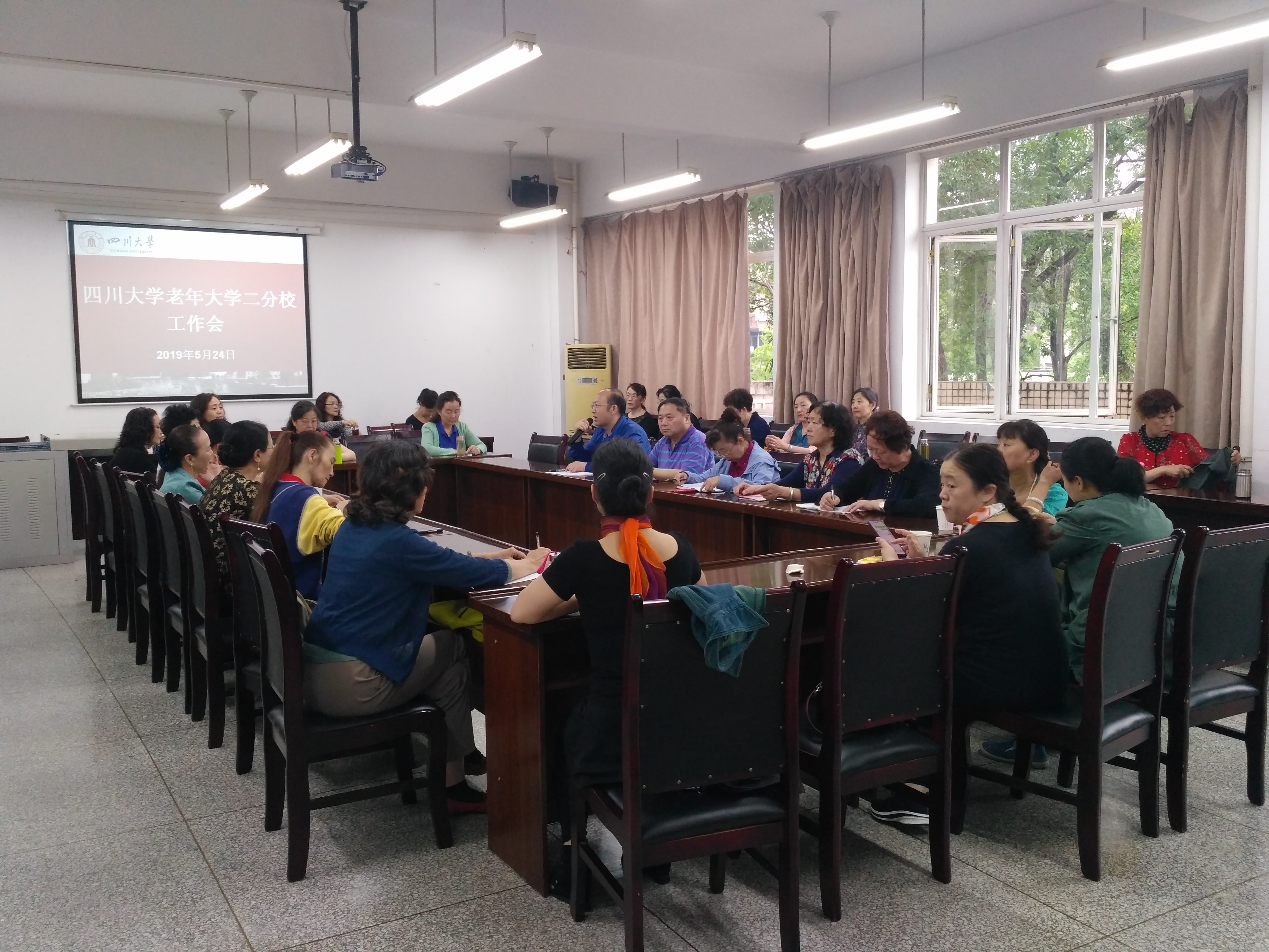 2019年5月24日上午,四川大学老年大学二分校在望江校区文化活动中心离退休处会议室召开每期一次的班长以上干部工作会。参加会议的有四川大学老年大学二分校校长唐登学、常务副校长杨万贵、离退休处处长兼二分校副校长杨静波和二分校管理人员、各系系主任和各专业班班长。