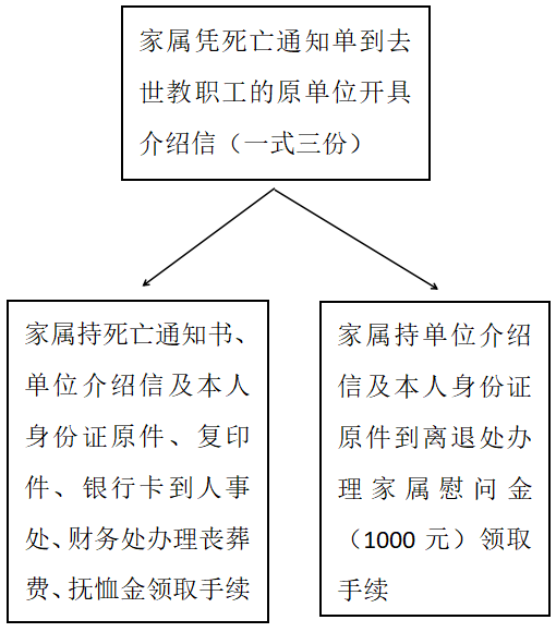 2、离退休教职工家属办理完丧葬事宜后,应按下列程序办理丧葬、抚恤、慰问等善后事宜(见图示)。