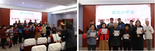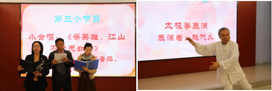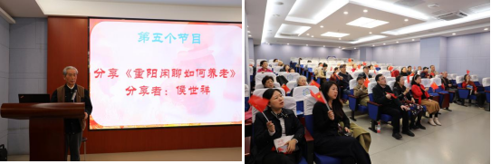 退休教职工合唱队三首大合唱拉开了联欢活动的帷幕,离退休教工党支部徐小平、李晋萍、胡晓娟、赵代火等退休老师分别带来了诗朗诵、小合唱和太极拳等表演。八十多高龄的侯世祥老师分享《重阳闲聊如何养生》,他结合自身学习心理学、运用AI的经历,提出“学习是一生之魂”。活动在全体人员齐唱《歌唱祖国》中将氛围推向高潮。