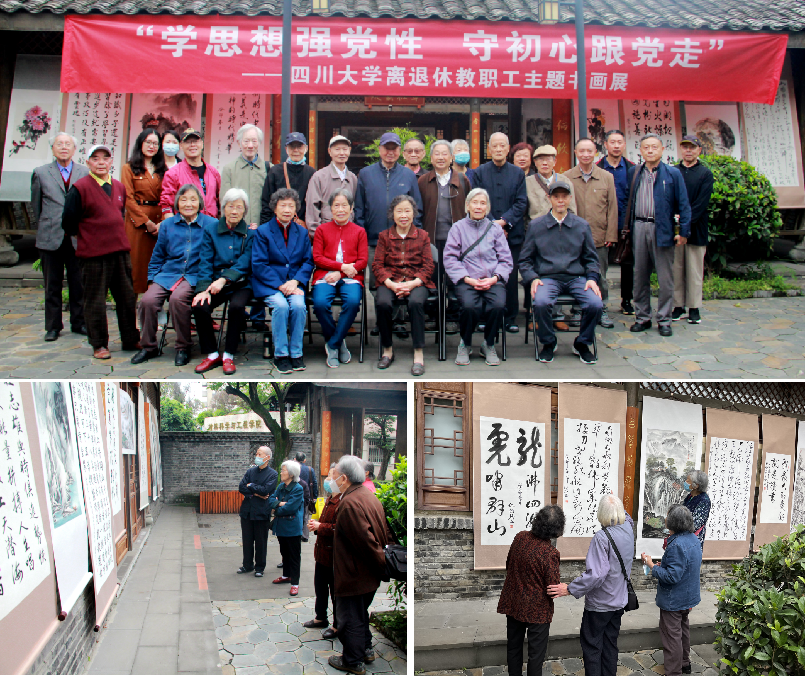 5月12日上午,由yl7703永利集团主办的“‘学思想强党性 守初心跟党走’——四川大学离退休教职工主题书画展”在望江校区竹筠苑活动中心开展。30余副展现新时代10年在以习近平同志为核心的党中央的领导下,党和国家取得的伟大成就;宣传伟大建党精神,传承弘扬红色基因;激励大家不忘初心听党话,坚定不移跟党走的书画作品在线下集中展出。与会老同志有序观看展览,一幅幅讴歌爱党敬党情怀的金钩铁画,一件件赞美祖国壮丽山河、展现新时代人民幸福生活的丹青水墨,吸引大家驻足欣赏。