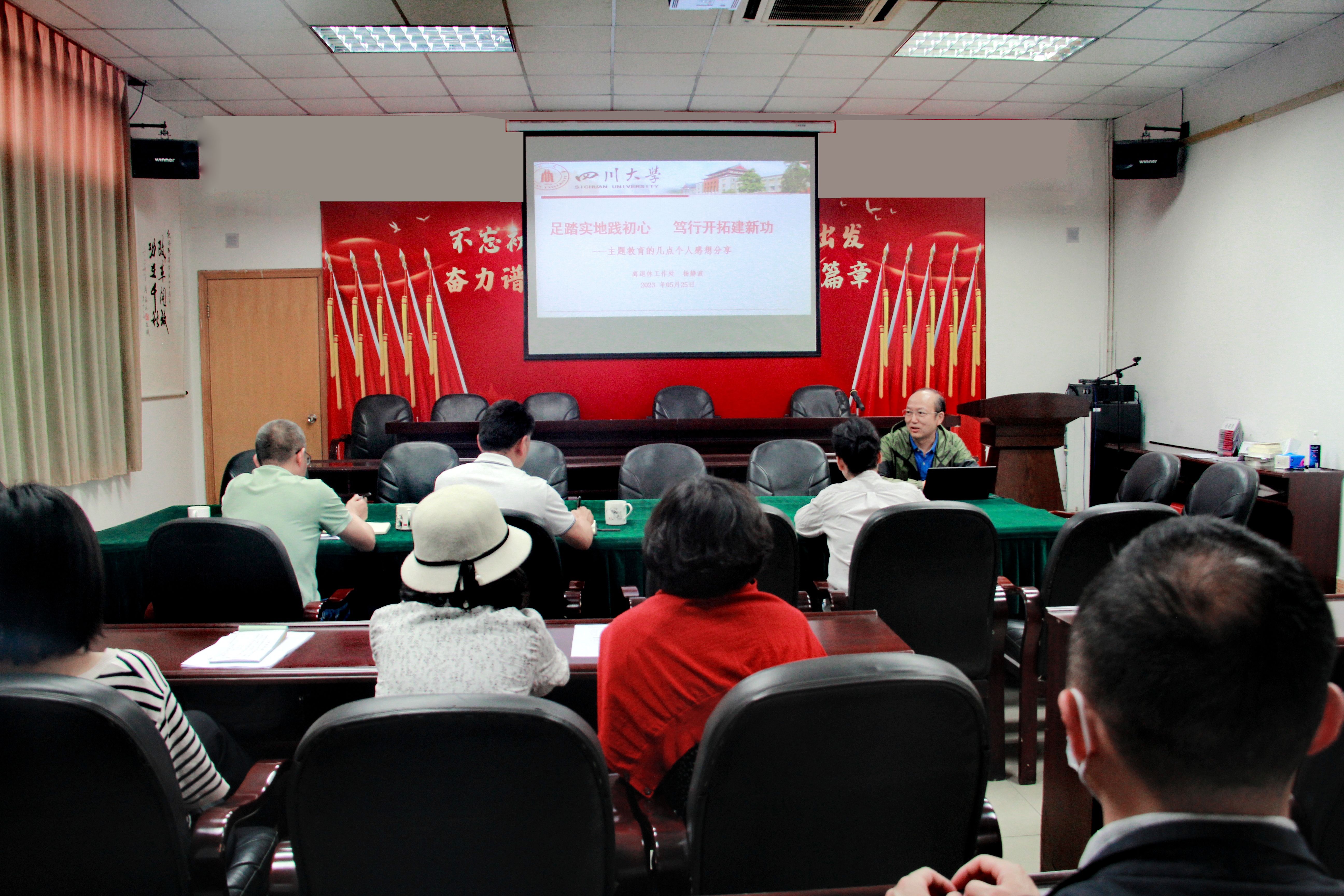 杨静波同志以《足踏实地践初心 笃行开拓建新功——主题教育的几点个人感想分享》为题,从“理论创新武装,紧跟时代步伐”“善学增本领,前行贮力量”“勤思勇担当,业精谱华章”“齐心同舒畅,功成必我在”四个方面与在场的党员干部分享了自己工作37年的成长阅历、工作经验、人生感悟,并用“诚、心、细、巧、安、和”六字感言勉励大家。